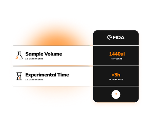 With just 0.12 uL per detergent (for triplicates) in detergent screening and down to 40nl of unpurified sample needed for characterisation, FIDA uses 10 to 100 less sample volume compared to other available technologies.